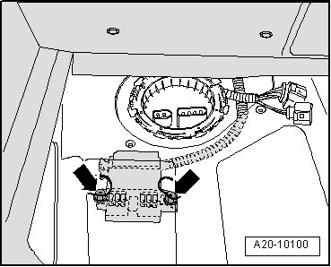 - Raise floor covering slightly upward in locking flange area by hand and remove Fuel Pump (FP) Control Module (J538) between floor covering and fuel tank locking flange.
