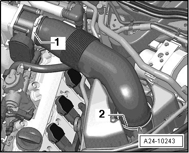 - Remove air guide hose between Mass Air Flow (MAF) Sensor 2 (G246) and Throttle Valve Control Module 2 (J544) by loosening hose clamps - 1 and 2 -.