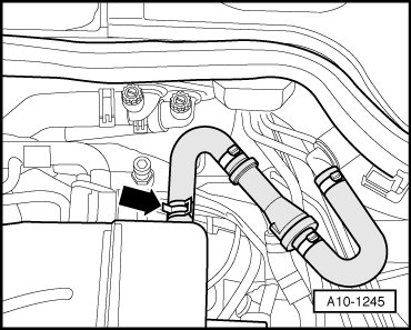 - Remove air guide hose between Mass Air Flow (MAF) Sensor (G246) and Throttle Valve Control Module (J544) by loosening hose clamps - arrows -.