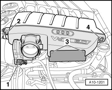 - Remove bolts - 2 through 4 - and remove right side part of intake manifold.