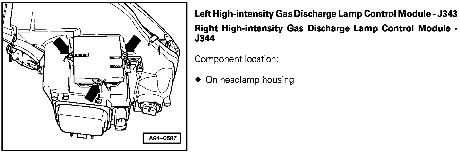 Left High-Intensity Gas Discharge Lamp Control Module J343, Right High-Intensity Gas Discharge Lamp Control Module J344