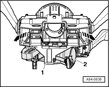 - Release retaining clips - arrows - and remove steering lock housing - 2 - from mount - 1 -.