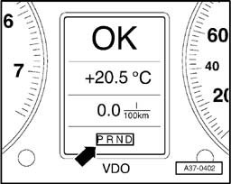 2 - The trouble code is stored and a substitute program allows the vehicle to continue to be driven (with some restrictions). The fully illuminated transmission range display in the instrument cluster shows the driver a simple malfunction (arrow). This malfunction is barely noticeable to the driver, but the brightly lighted transmission range display is intended to indicate that he or she should consult an authorized dealer as soon as possible to avoid subsequent damage in the transmission.