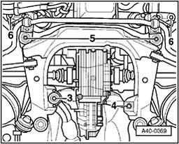 - Insert subframe and install hex bolts - 5 - and - 6 -.