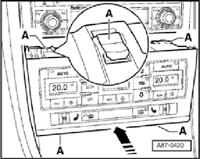 - The operating and display module, Climatronic Control Module J255 is held in position in the center console by way of 4 clips - A -.