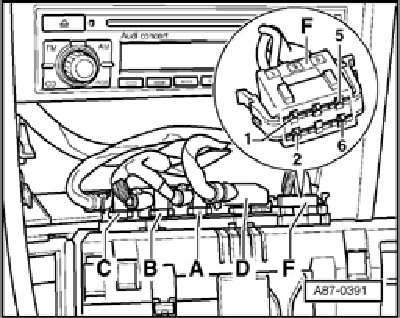 - Release connectors - A - to - D - and - F - by pressing retainer tabs and disconnect connectors.