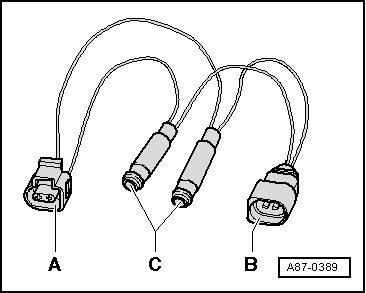 • An adapter cable can also be used for this test. To do this, e.g. use one connector each - A - and - B - (part number 1J0 973 702 and 1J0 973 802 and relevant terminal contacts), two standard sockets for banana connectors - C - and two wires with 0.5 mm 2 diameter.