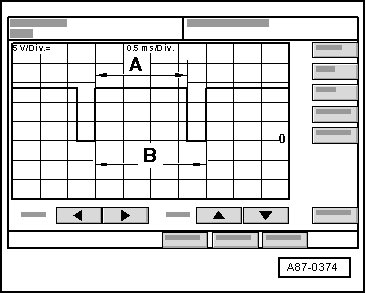 - A square wave signal with an impulse width - A - between 75% and 100% (A/C compressor regulator valve (N280) is activated) for operating mode "Auto" and temperature setting "Low".