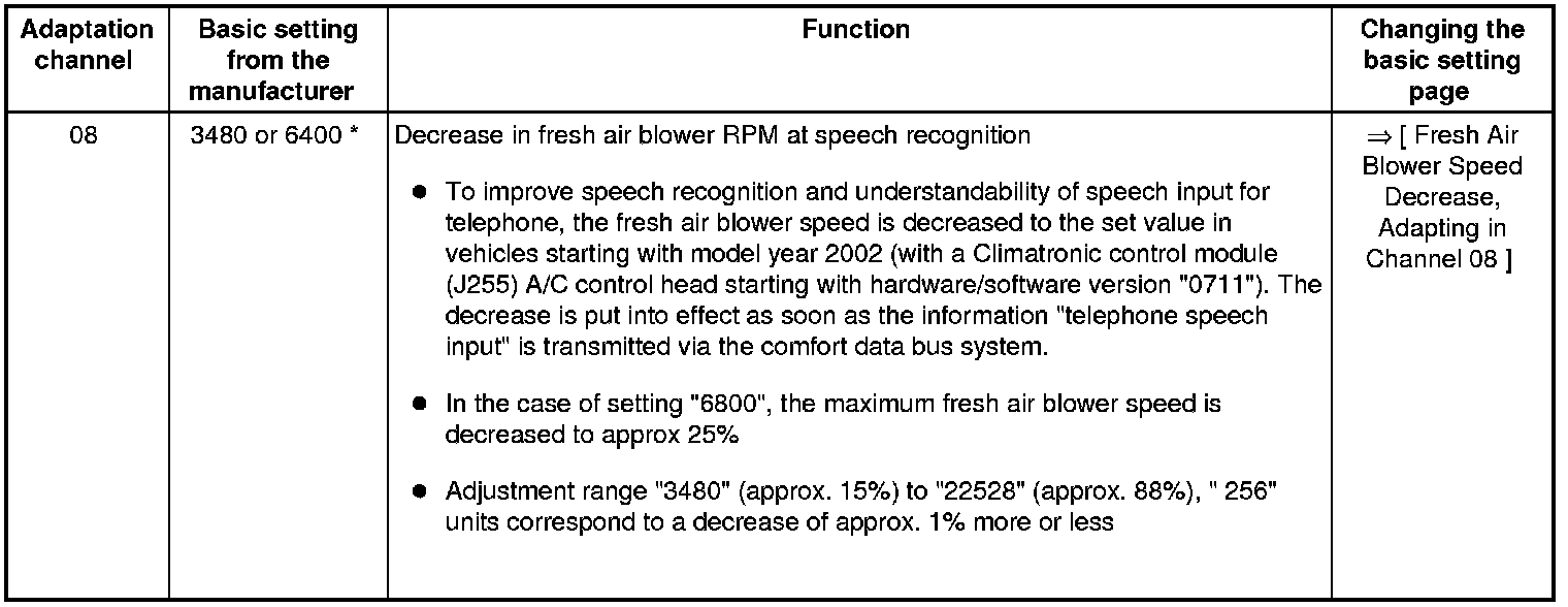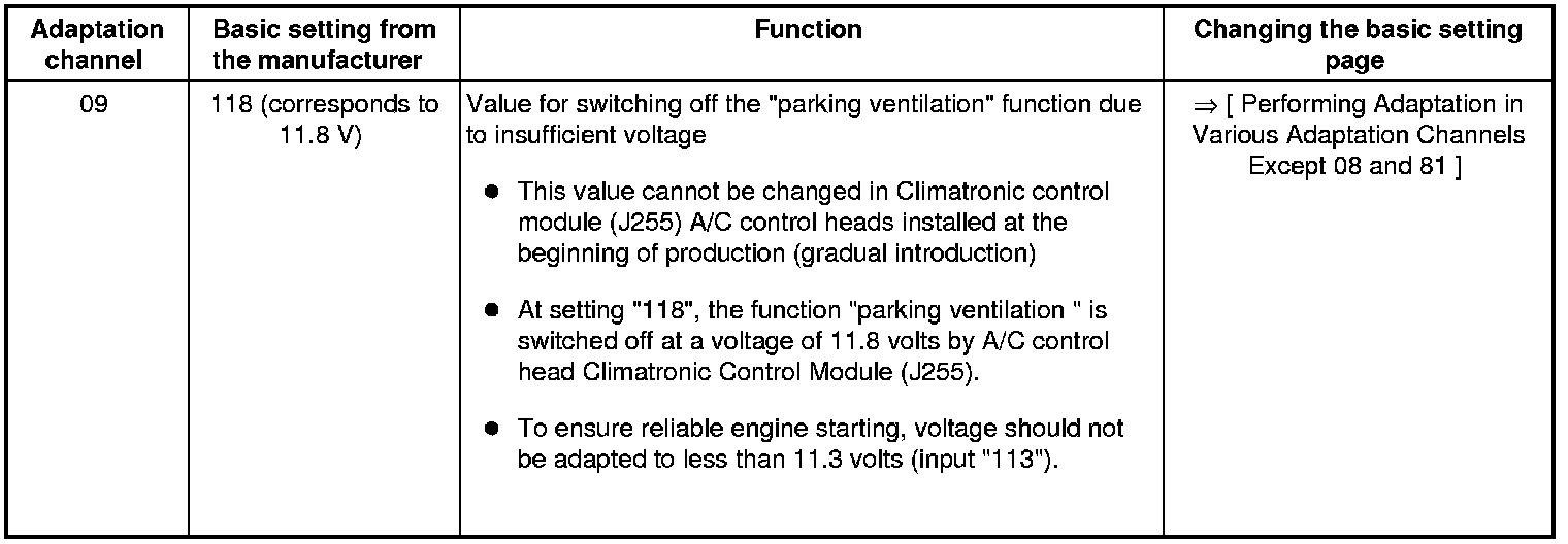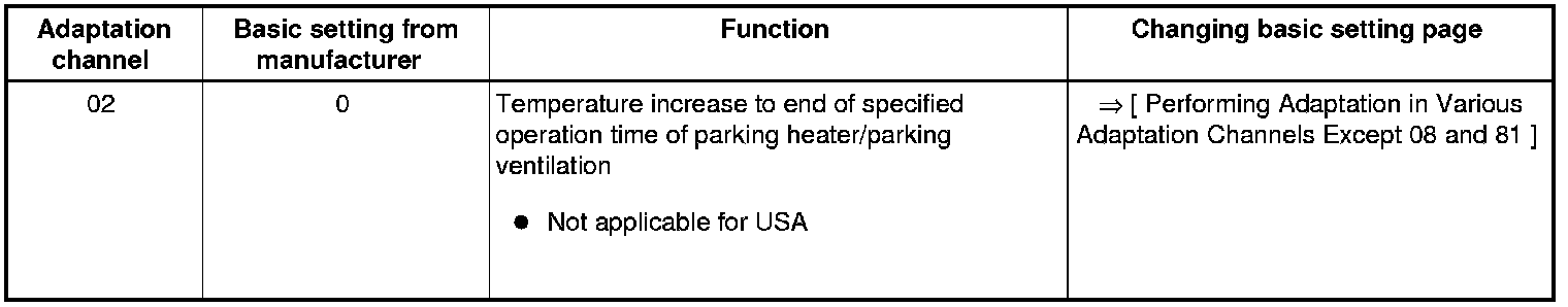 • Adaptation channels "01", "02", "06 ", and "07" are in effect only for vehicles in which a parking heater is installed as optional equipment. In these vehicles, data is exchanged between the Climatronic control module (J255 ) A/C control head the auxiliary heater control module (J364), and the instrument cluster control module (J285) via the comfort data bus system. Not applicable for USA