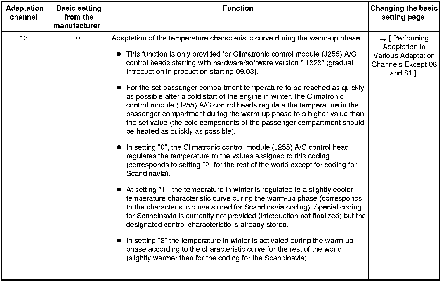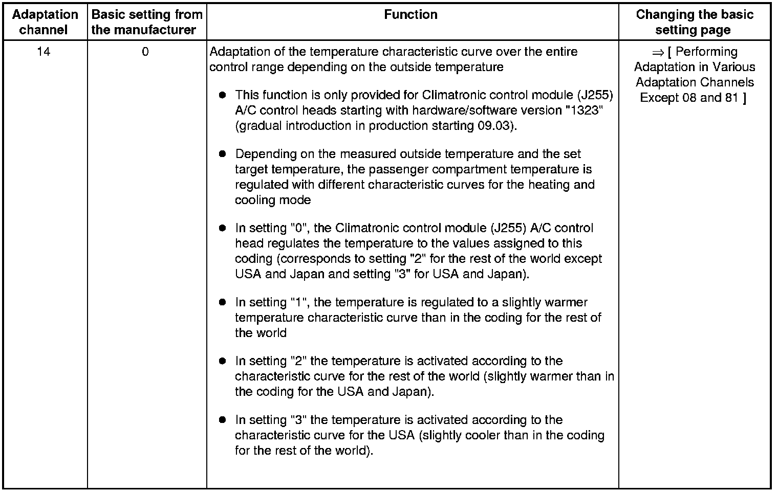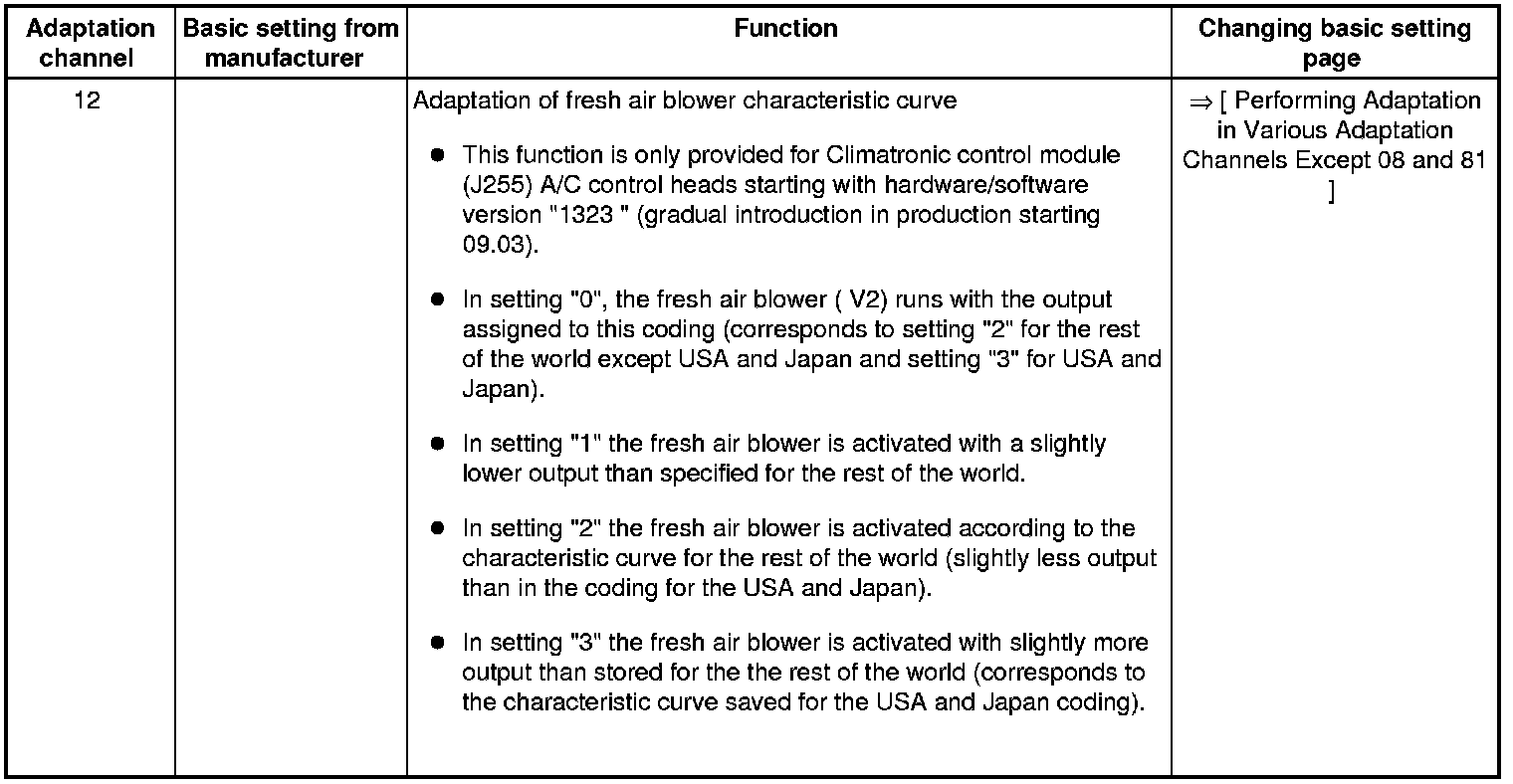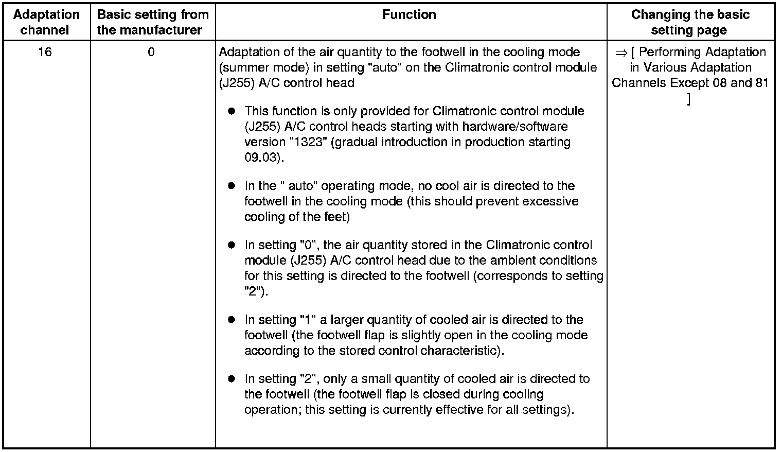 • Adaptation channels "10" through "16" are only provided for a Climatronic control module (J255) A/C control head starting with hardware/software version "1323 " (gradual introduction in production from 09.03).