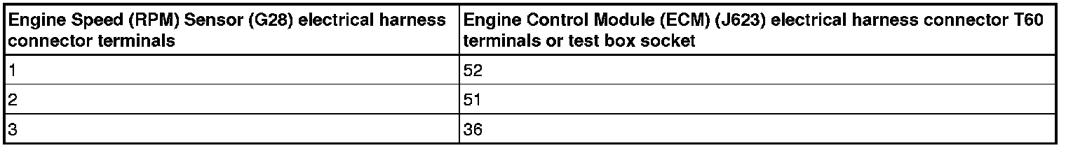 - Using a Multimeter, check the Engine Speed (RPM) Sensor (G28) electrical harness connector terminals to the Engine Control Module (ECM) (J623) electrical harness connector T60 terminals for resistance.