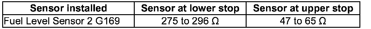 - To check resistance values "tank full" or "tank empty" , the Fuel Level Sensor 2 G169 must be removed and the sensor floater must be placed in upper or lower end position.