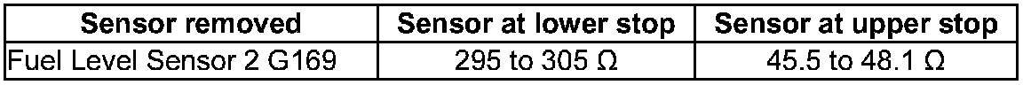 - With Fuel Level Sensor 2 G169 removed, the following values are obtained because of the greater deflection of the floater arm: