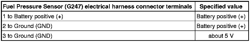 - Using a Multimeter, check the Fuel Pressure Sensor (G247) electrical harness connector terminals for voltage.