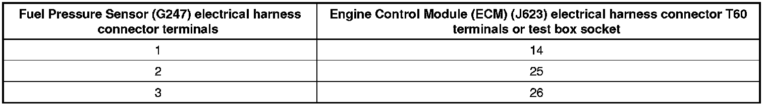 - Using a Multimeter, check the Fuel Pressure Sensor (G247) electrical harness connector terminals to the Engine Control Module (ECM) (J623) electrical harness connector T60 terminals for resistance.
