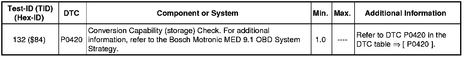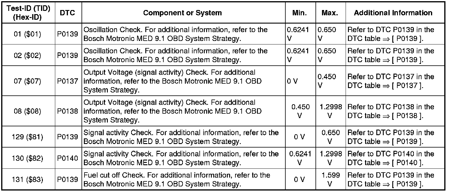 - If any of the components or systems fail to meet the specified values, refer to Diagnostic "Mode 03: Interrogating Fault Memory" to check for stored DTC's or the corresponding diagnostic repair procedure => [ Diagnostic Mode 03 - Read DTC Memory ] Diagnostic Mode 03 - Read DTC Memory.