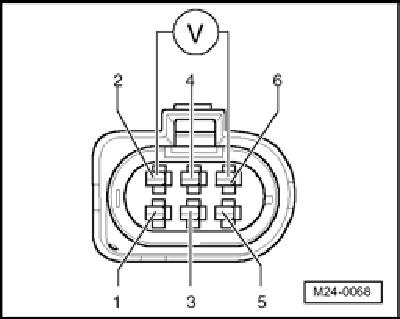- Using a Multimeter , check the Throttle Drive (for Electronic Power Control (EPC)) G186 at the Throttle Valve Control Module J338 electrical harness connector terminals 2 to 6 for voltage.