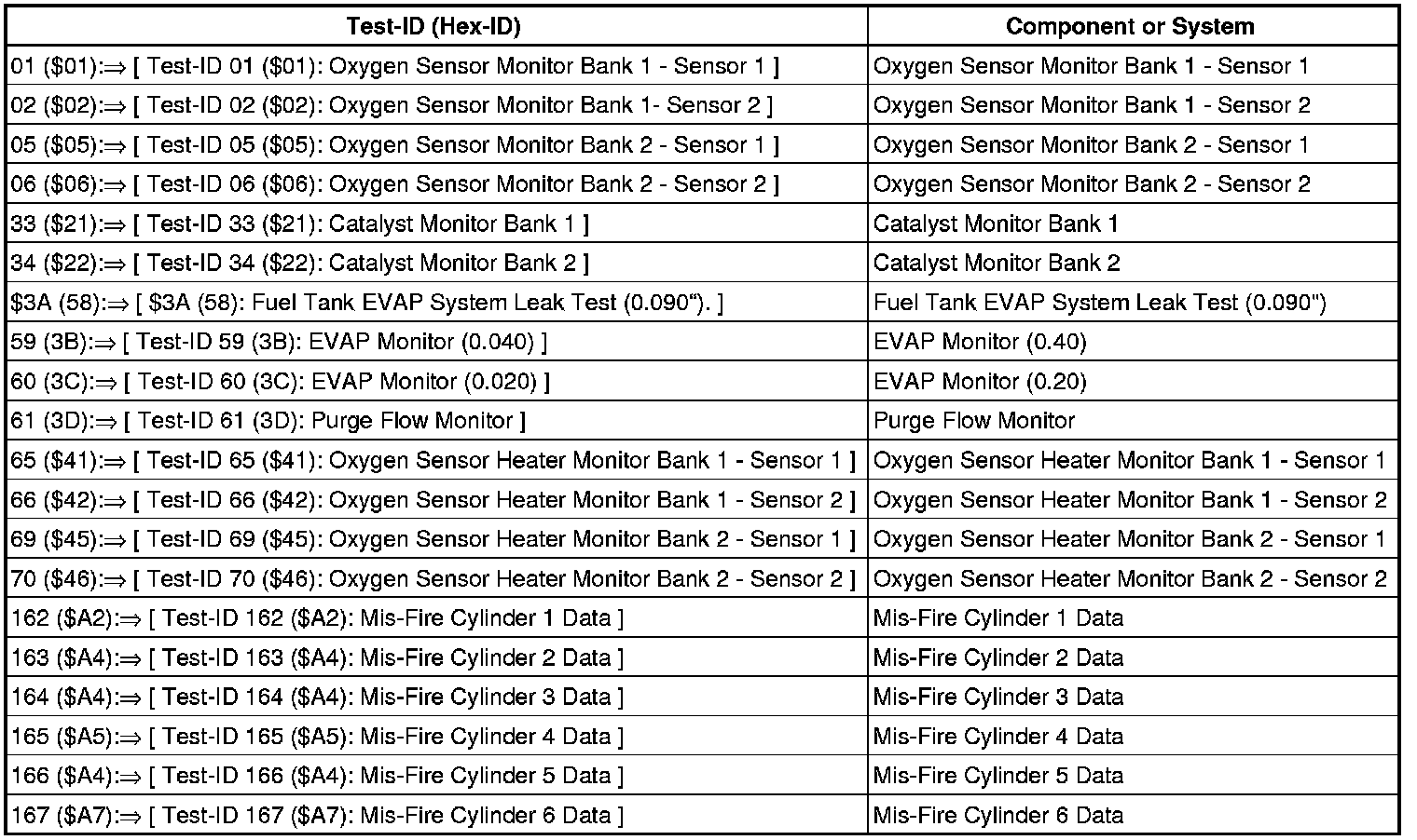 Depending on scan tool and protocol used, the information displayed may be referred to by different names such as Test-ID (TID), Hex-ID, Component-ID (CID), On-Board Diagnostic Monitor Identifier (OBDMID), or contain no name at all and be referenced by only a number.