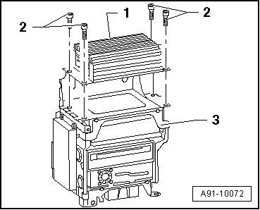 - Remove the screws - 2 - (4 Nm) and remove digital sound system control module - 1 - from rack - 3 -.
