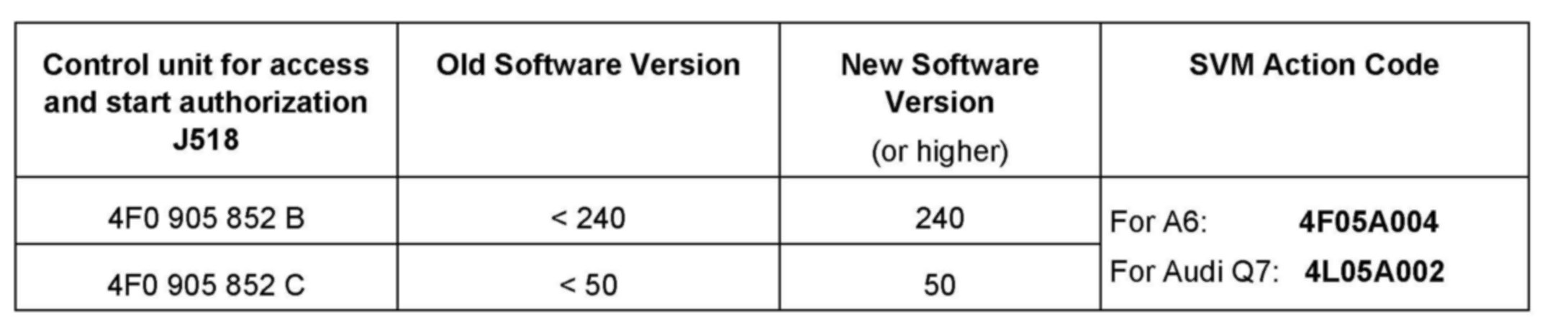 ^ Control unit for access and start authorization J518 (address 05) SW version below 240 (4F0 905 852 B) or below 50 (4F0 905 852 C).