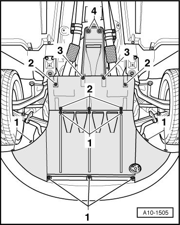 - Remove the bolts - 2 and 3 - and the engine carrier - 4 - with the stabilizer bar.