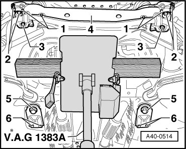 - Tighten the bolts - 3 and 5 - in a diagonal sequence and to specification. For bolt - 5 -, see - item 8 - and for bolt - 3 - see - item 19 - in => [ Subframe, Engine Carrier and Stabilizer Bar Assembly Overview ] Subframe, Engine Carrier and Stabilizer Bar Assembly Overview.