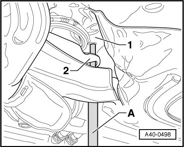 - Align the engine carrier and subframe to each other using an 8 mm drift - A -. The holes in the subframe - 1 - and engine carrier - 2 - must be aligned vertically.