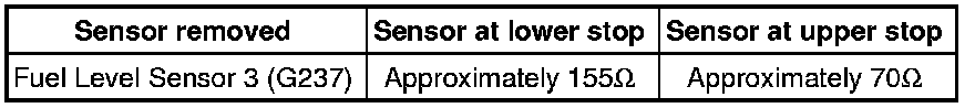 • To check resistance values "tank full" or "tank empty", the Fuel Level Sensor 3 (G237) must be removed. Refer to => [ Fuel Level Sensor 3, Left Tubular Sensor ] Fuel Level Sensor 3, Left Tubular Sensor and the sensor floater must be allowed to float to upper or lower end position.