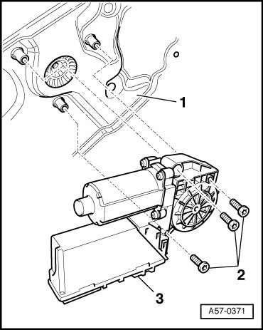 - To remove, unscrew bolts - 2 - and remove window regulator motor - 3 - from assembly carrier - 1 -.