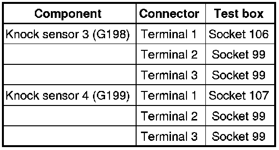 - Check resistance between terminals 1 + 2, 1 + 3 and 2 + 3 at the connections to the respective knock sensors. Specification: infinite ohms