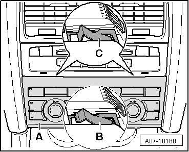 • The Climatronic control module - A - is held in the center console via retaining clips - B - (on lower side) and - C - (on upper side).