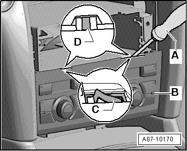 - Using two small screwdrivers - A -, disengage catches of both top clips - C - (above slots in instrument panel center section - D -), then grasp under the Climatronic control module - B - and carefully pull it out of center console.