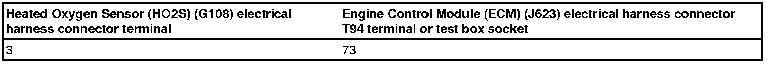 - Using a multimeter, check the Heated Oxygen Sensor (HO2S) (G108) electrical harness connector terminal 3 to the Engine Control Module (ECM) (J623) electrical harness connector T94 terminal 73 for resistance.