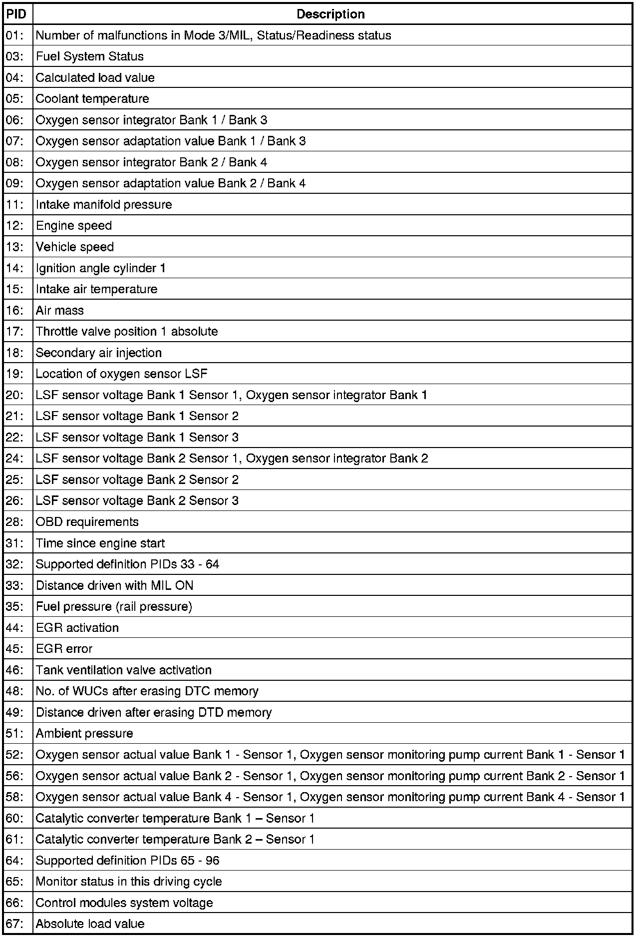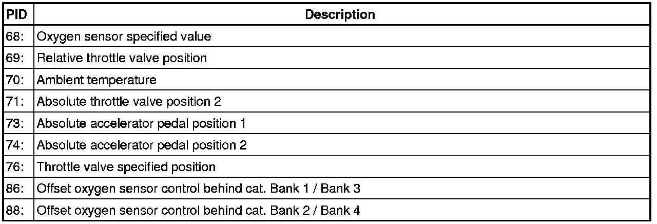 Diagnostic Mode 01 makes it possible to access current emissions-related measured values and diagnostic data. The original measured values (no replacement values), input and output data and system status information are displayed using Diagnostic Mode 1.