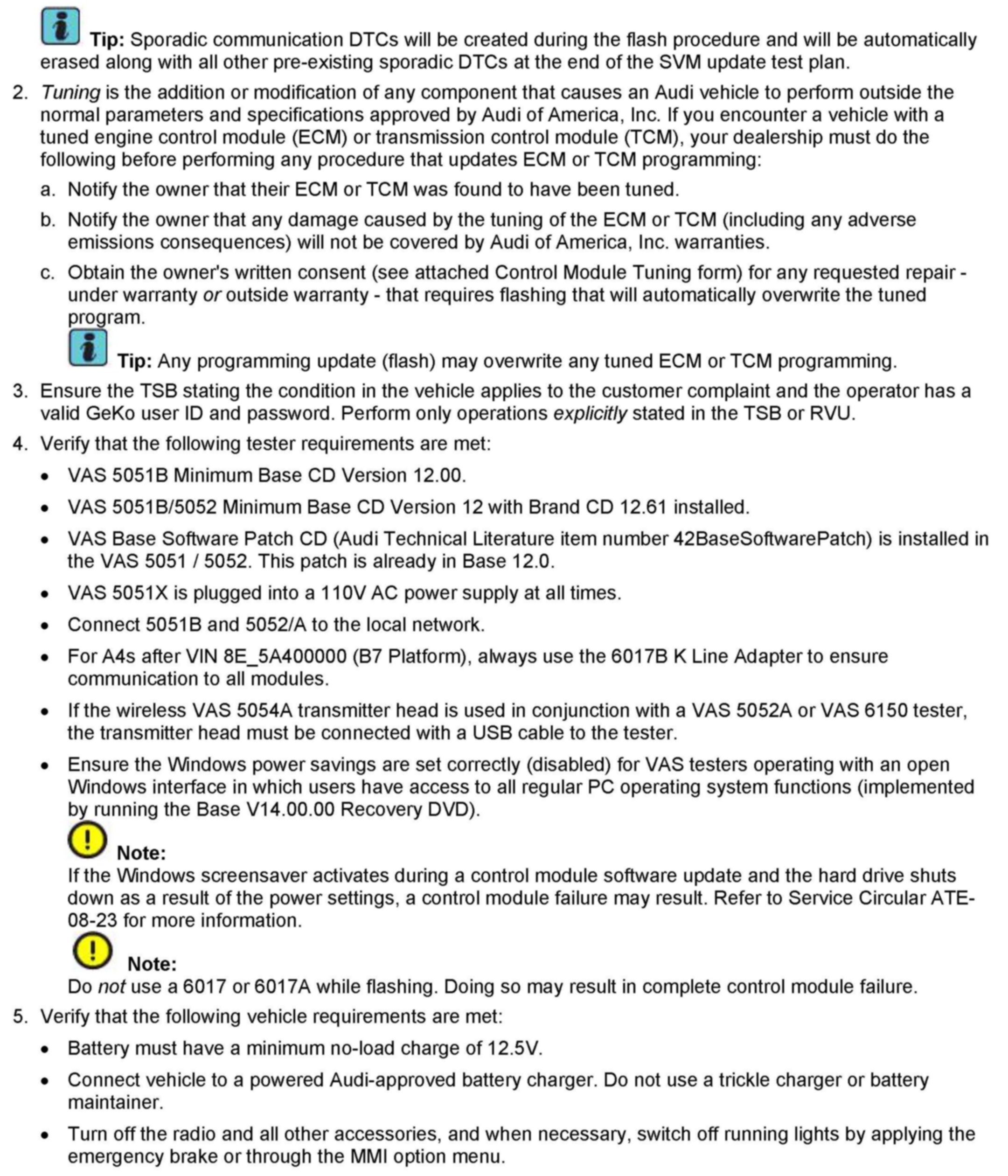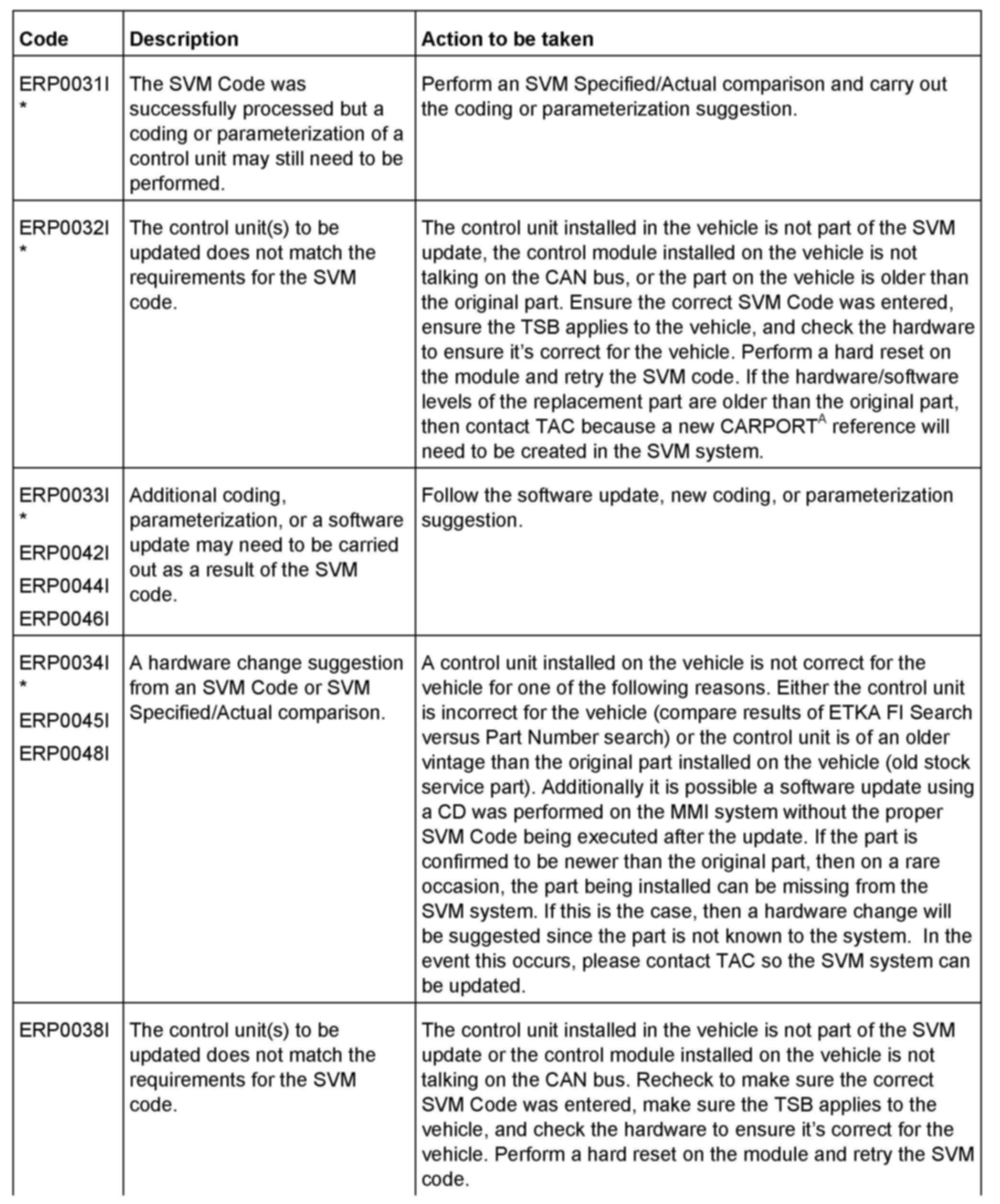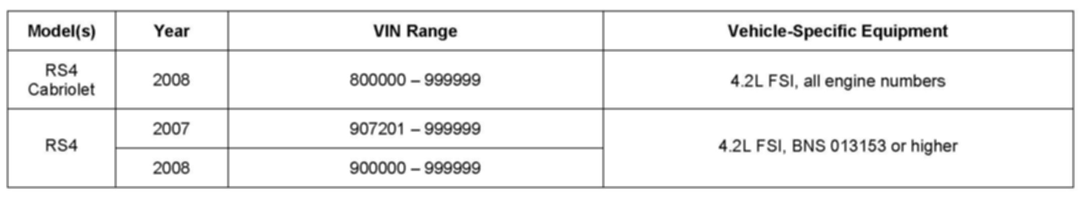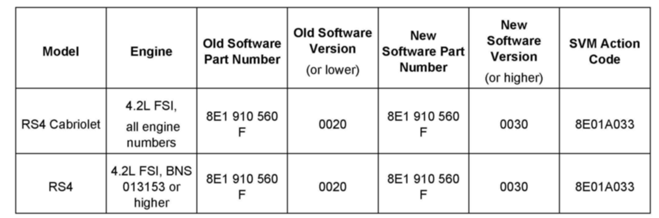 2. Update the ECM software of the affected vehicles (two ECMs for RS4) using the SVM action code as listed in the table above if necessary.