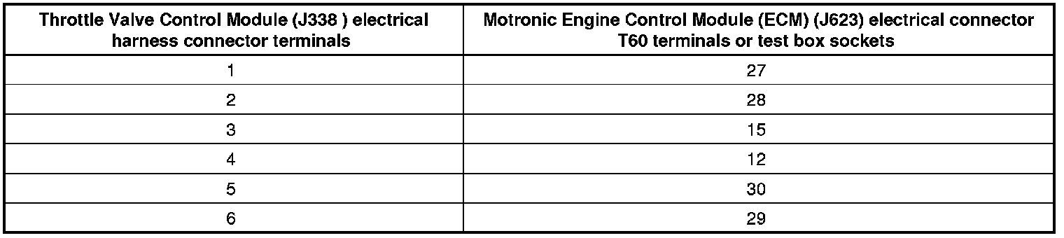 - Using a Multimeter, check the Throttle Valve Control Module (J338) electrical harness connector terminals to the Motronic Engine Control Module (ECM) ( J623) electrical harness connector T60 terminals for an open circuit.