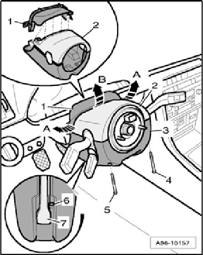 - Release trim cover - 1 - on upper steering column trim - 2 - using a small screwdriver - arrows A and B -.