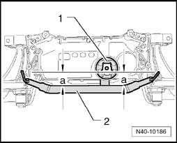 - Align tube T10214/2 on subframe with pressed in bonded rubber bushings. Edges of bonded rubber bushing inner core -1- must run on imaginary line parallel to edge of Assembly Tool T10267 -2-.