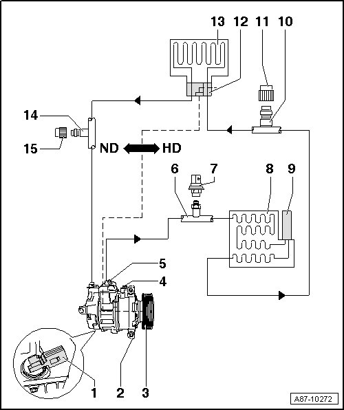 • Depending on time period of production and on engine, compressor construction type may vary. Refer to Electronic Parts Catalog (ETKA).