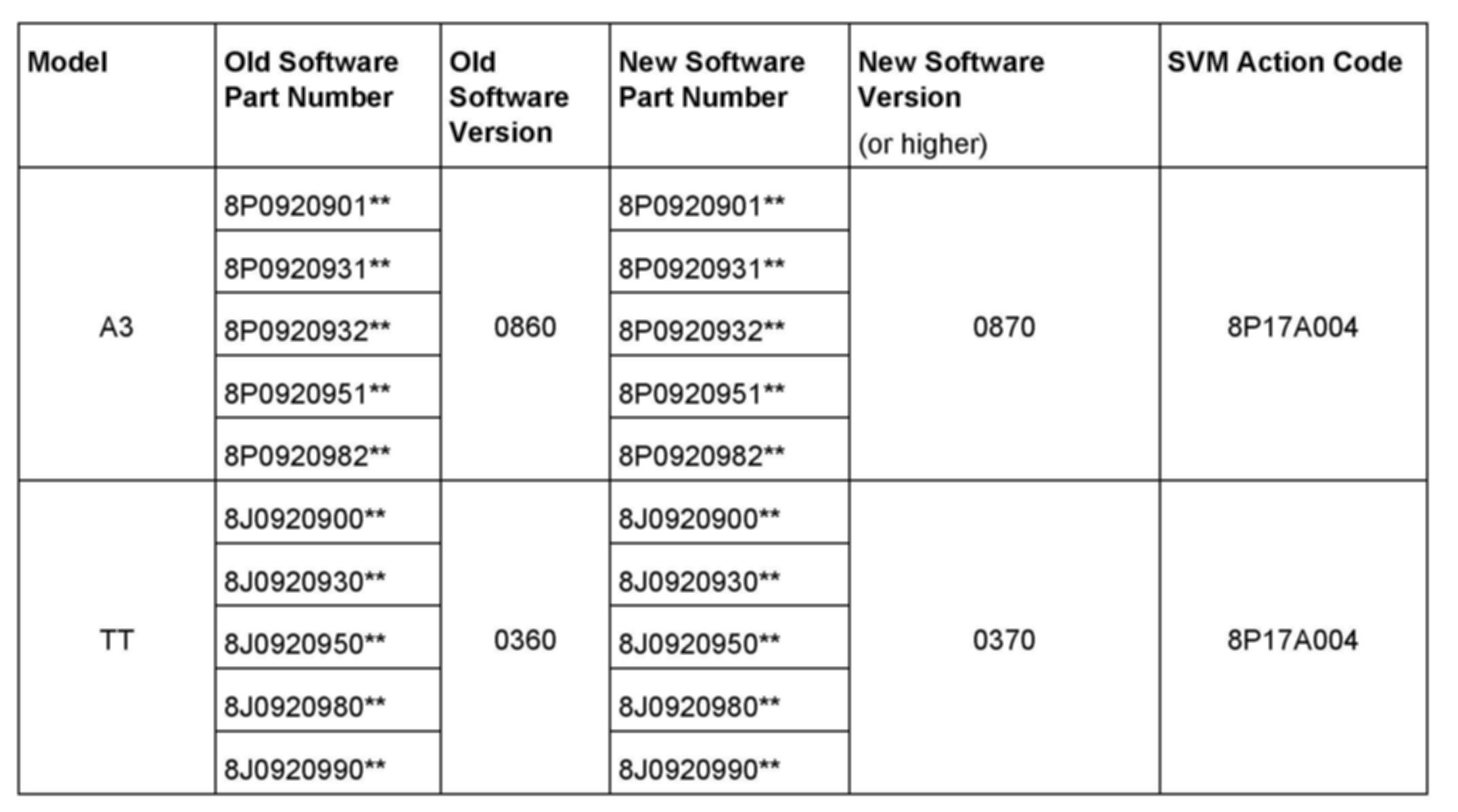 ^ Instrument clusters with software version 0860 (A3) and 0360 (TT) are affected.