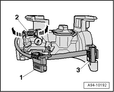 - Remove ignition switch - 3 - in - direction of arrow - from steering lock housing. The jeweller's screwdriver or wire hooks must remain inserted.
