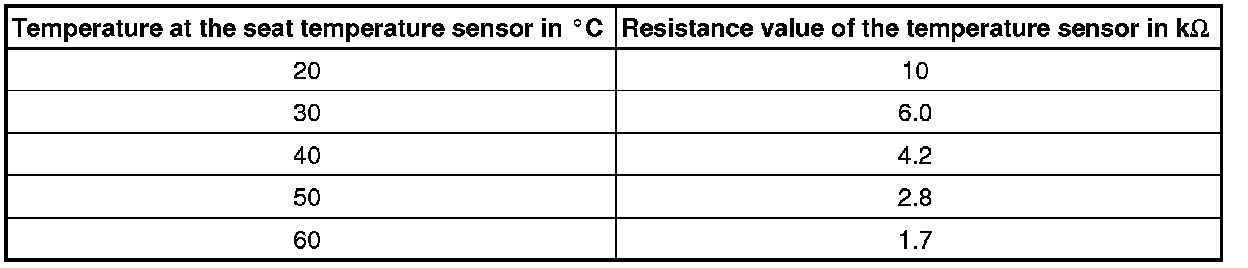 The resistance value of the temperature sensor in the heating elements of the seats changes with the temperature (the specifications in the following table are approximate values).