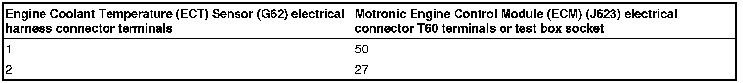 - Using a multimeter, check the Engine Coolant Temperature (ECT) Sensor (G62) terminals 1 to 2 for resistance.
