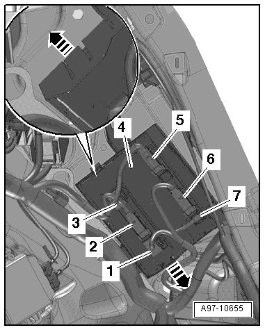 - Open the clips - arrows - and remove the comfort system central control module (J393) - 4 - from the retainer.