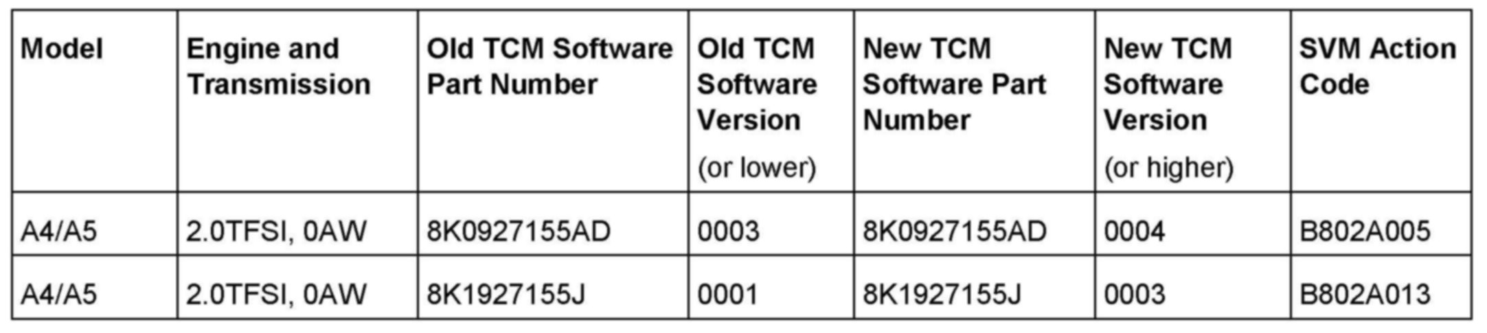 3. Update the TCM (J217) using the SVM action code as listed in the table above if necessary.