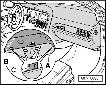 The service cover - A - is secured with 4 retainers - C - to the bottom of the glove compartment - B -. The retainers may be difficult to loosen.