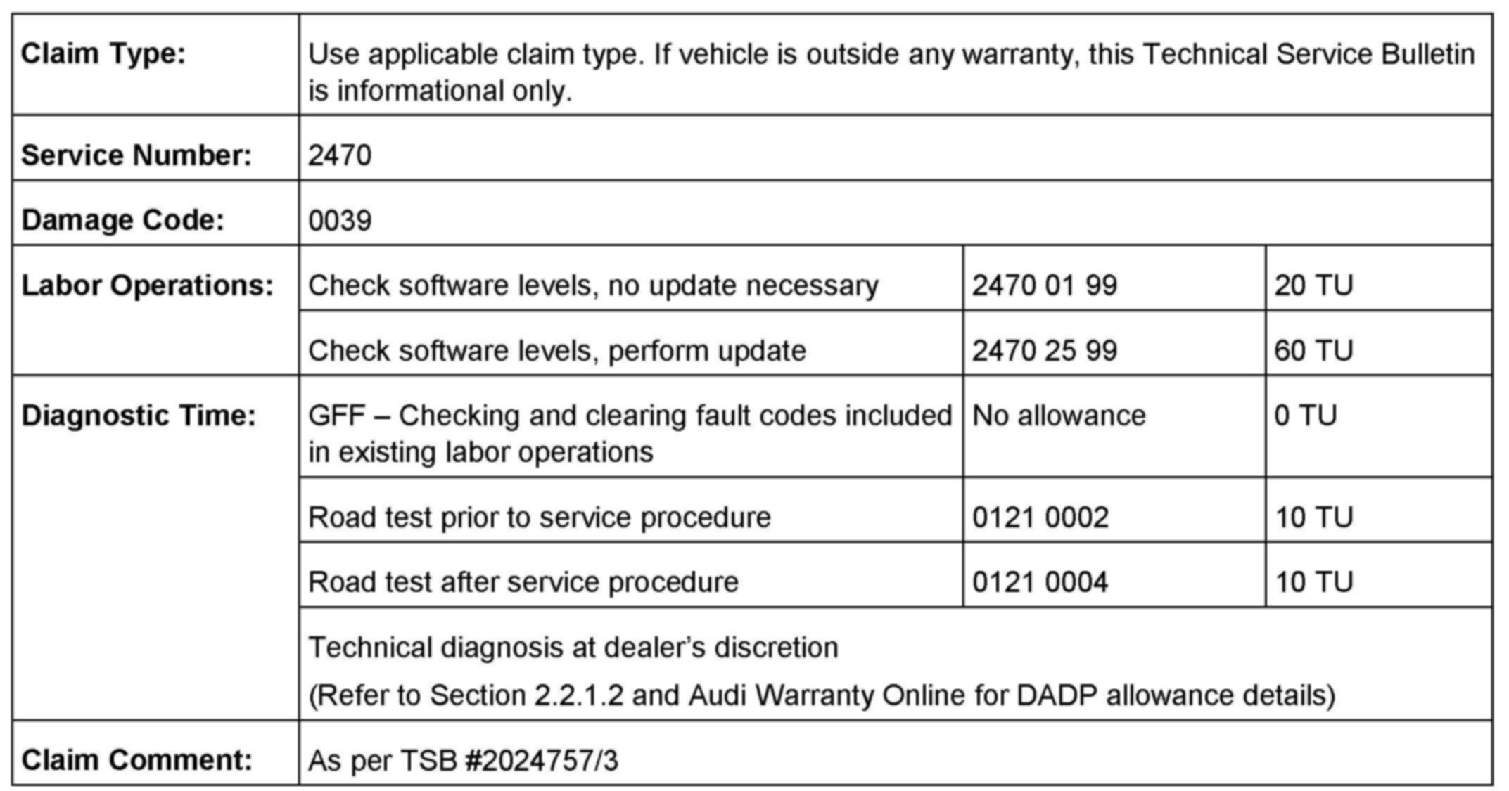 All warranty claims submitted for payment must be in accordance with the Audi Warranty Policies and Procedures Manual. Claims are subject to review or audit by Audi Warranty.