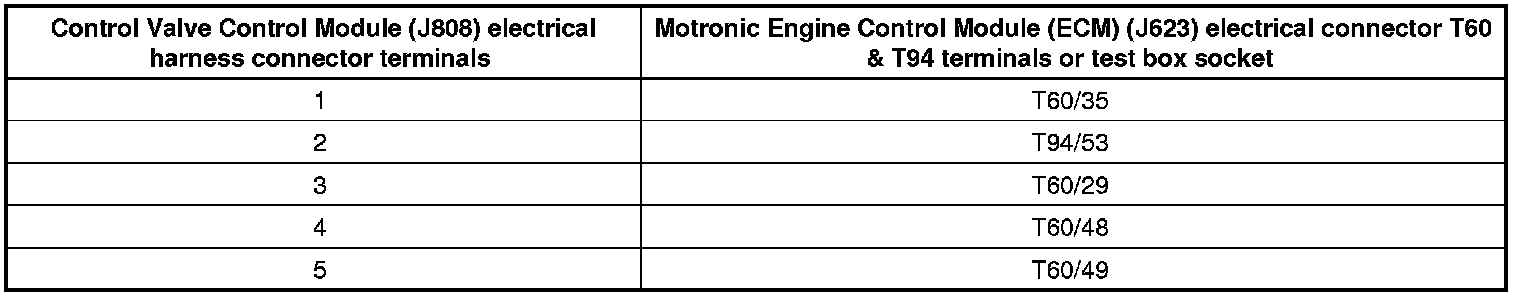 - Using a multimeter, check the Control Valve Control Module (J808) at electrical harness connector terminals to the Motronic Engine Control Module (ECM) (J623) electrical harness connector T60 & T94 terminals for an open circuit according to the wiring diagram.