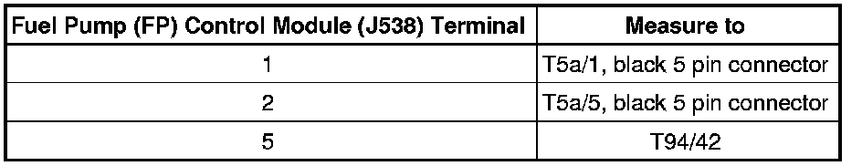 - Using a multimeter, check the Fuel Pump (FP) Control Module (J538) wiring harness terminal 1 to T5a/1, black 5 pin connector, for resistance.