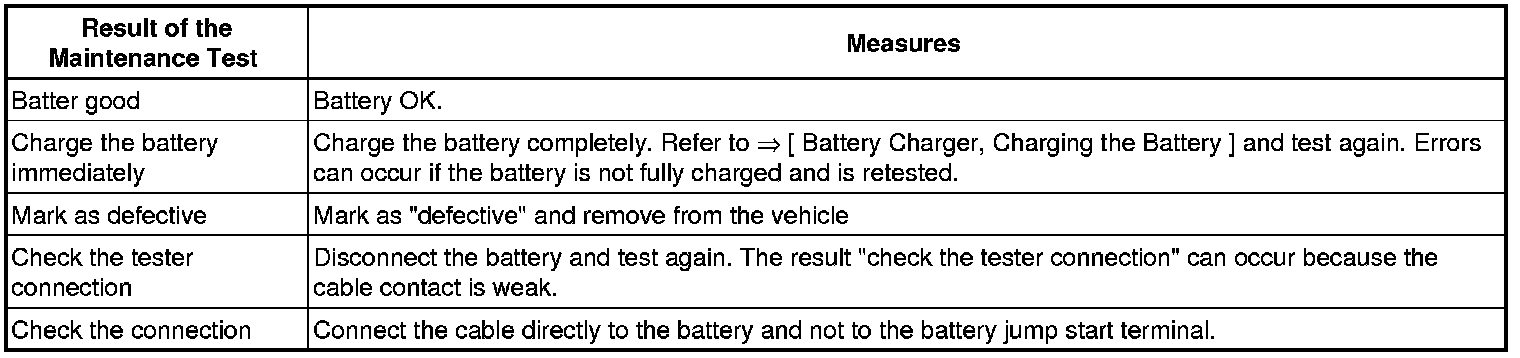 - On a battery with a "visual indicator", check its color display. Refer to => [ Electrolyte Level Color, Checking ] [1][2]Maintenance Free Battery.